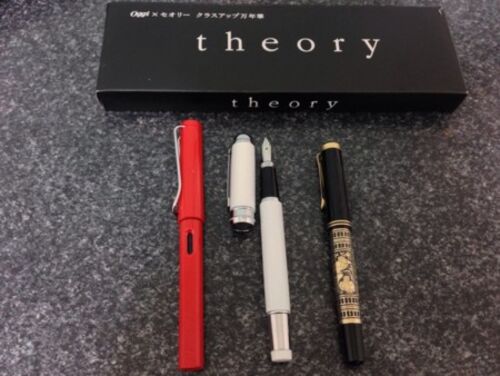 30代女性向けのファッション誌 Oggi 今月号(2014年1月号)に、ファッションブランド theory (セオリー)ブランドの万年筆が付いてきます。 写真真ん中の白いペン。左の赤いペンは LAMY Safari、右はペリカントレド M710。長さの比較に。ラミーよりもホンの…