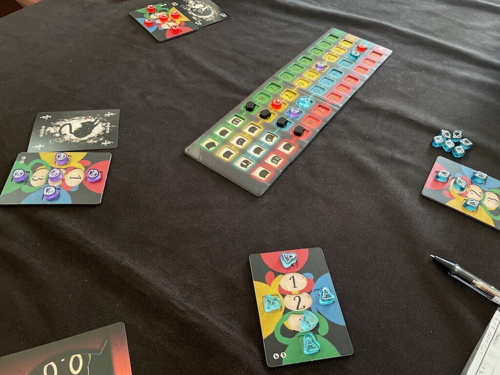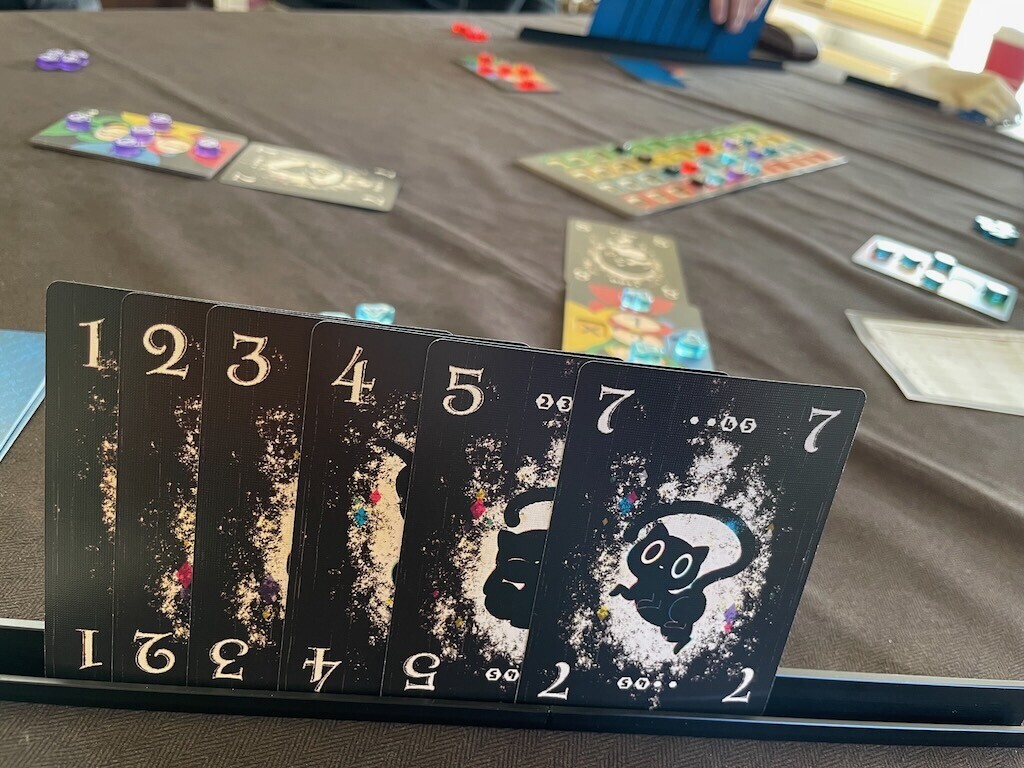 今回4人でプレイ。観測するまで状態がわからない量子力学(シュレディンガーの猫)とトリックテイキングがうまく組み合わさっています。不思議なプレイ感と王道的でスタンダードなトリックテイキングの良さが合わさっています。